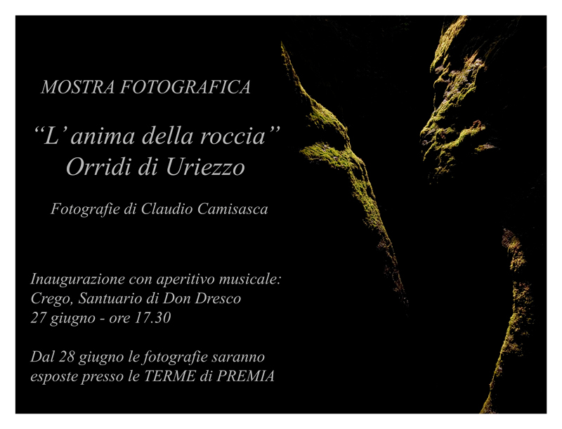 In occasione della Quinta "AT ZALUT" , memorial Guido Gerla lo staff del Rifugio Monte Zeus organizza, nel week-end 27/28 giugno, una serie di iniziative a Crego. Alle 17.30 di sabato 27 ci sarà l'inaugurazione della Mostra Fotografica "L'anima della Roccia", gli Orridi di Uriezzo, di Claudio Camisasca, esposta nel magnifico loggiato del Santuario di Don Lorenzo Dresco (di cui allego locandina).